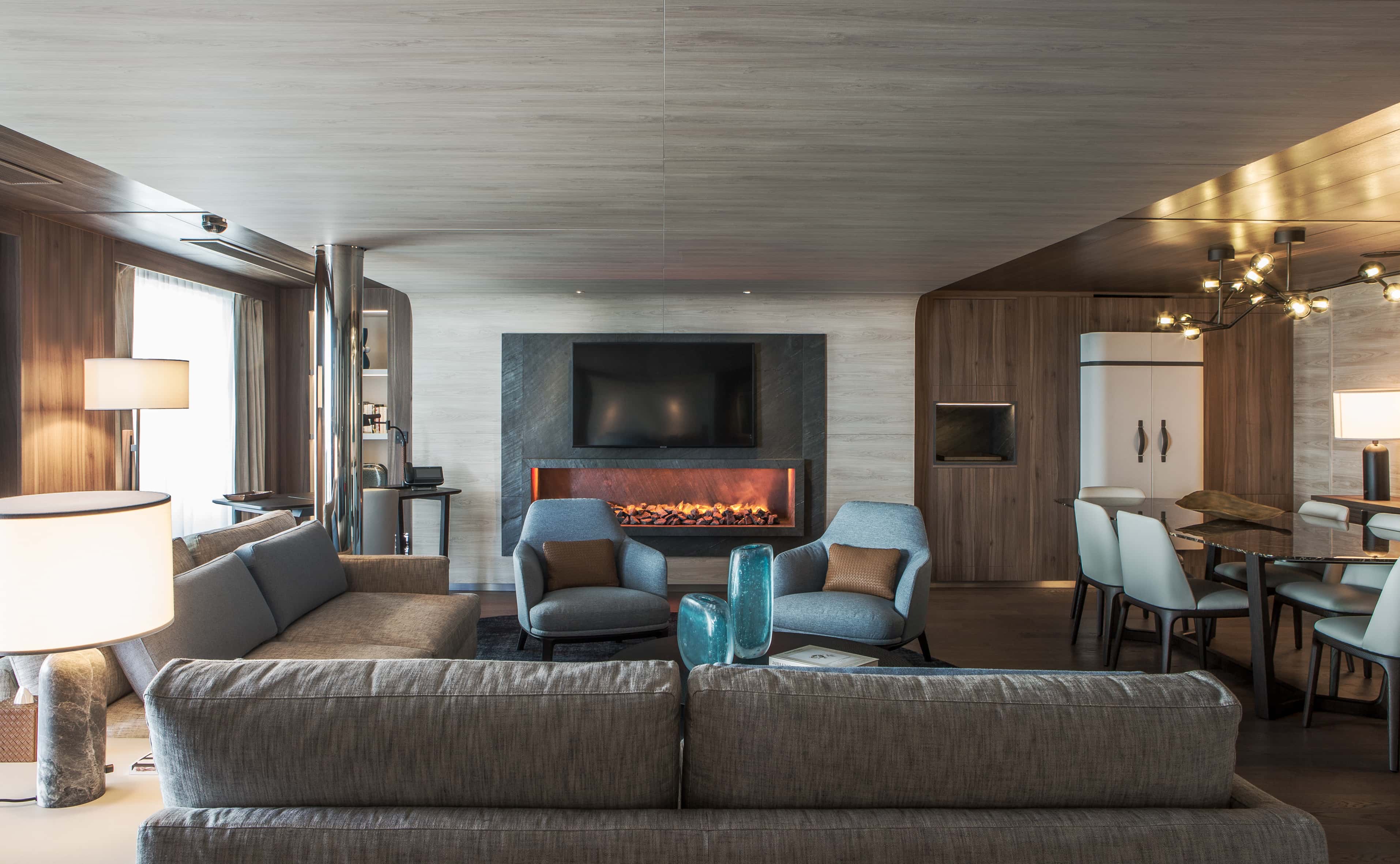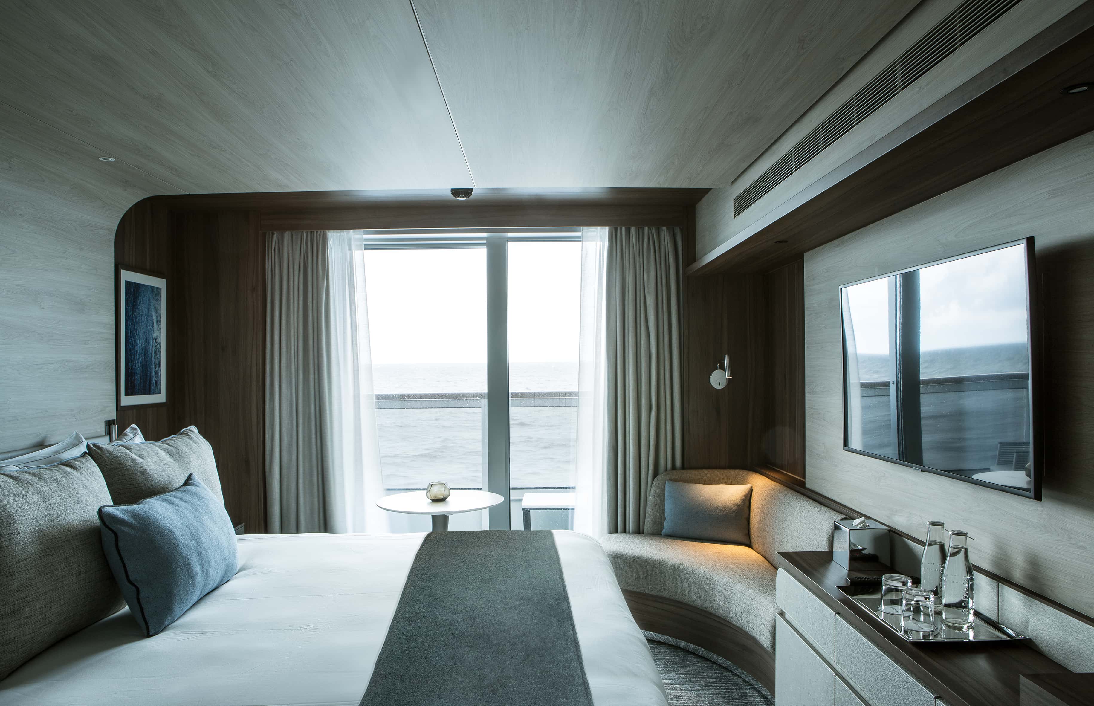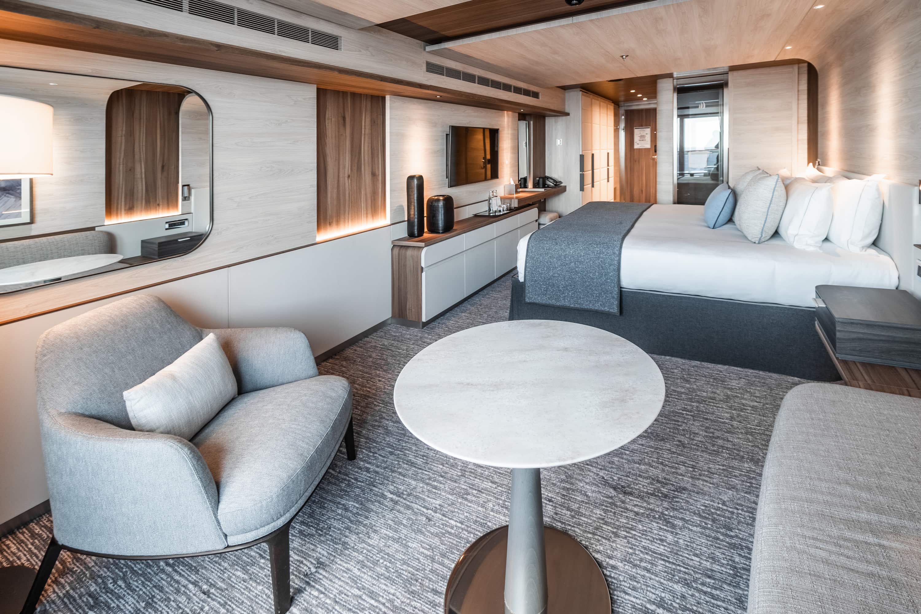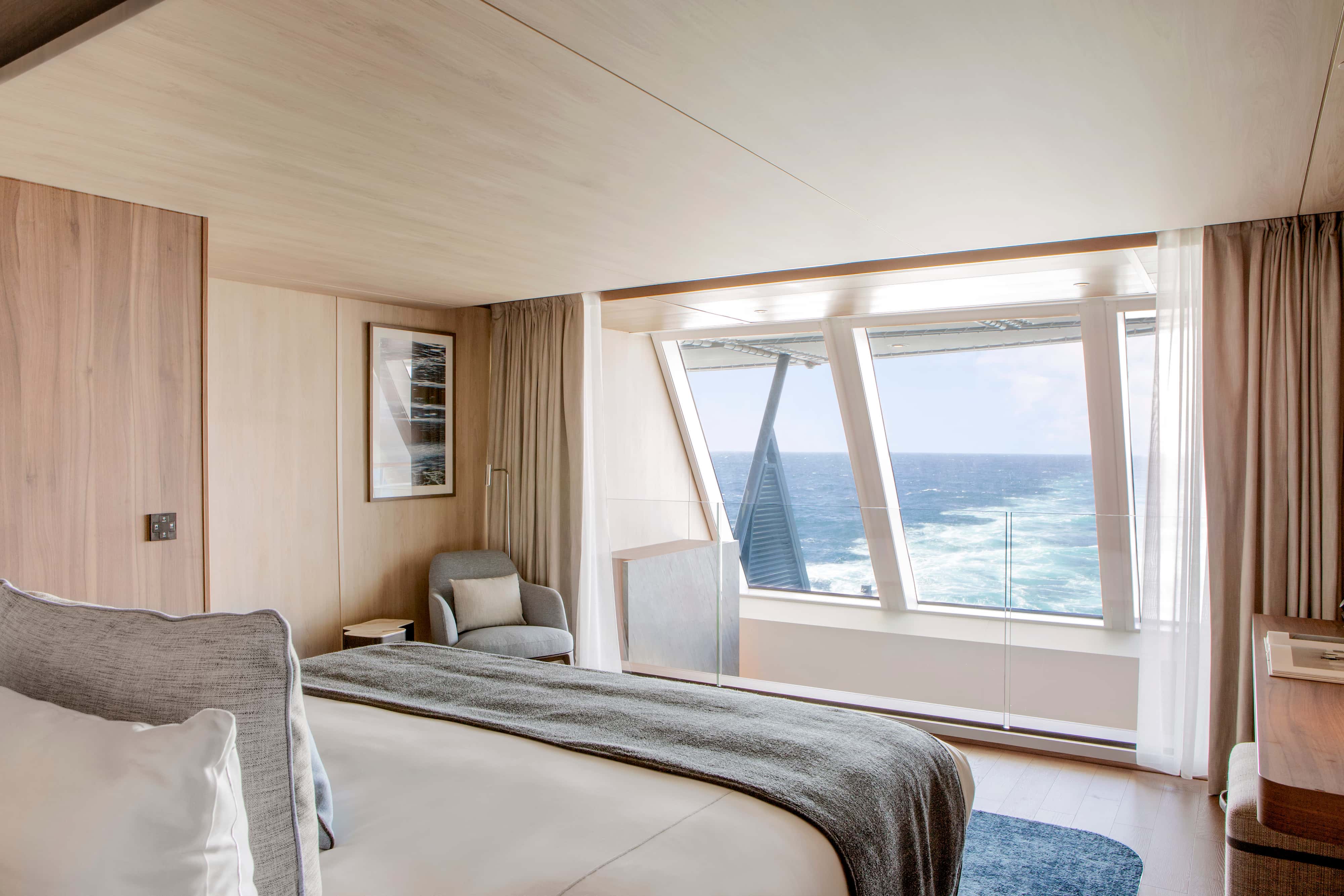 Die Owner Suite ist ca. 115m² groß und bietet Privaten Rücktransfer, Priority Boarding, Champagner und Obstkorb bei der Ankunft, Butler-Service, jeden Tag eine Auswahl an süßen oder herzhaften Canapés und Obst, Schlafzimmer mit Kingsize-Doppelbett (180 x 200 cm) oder zwei Einzelbetten (90 x 200 cm), Wohnbereich mit Sesseln, zwei Schlafsofas, Elektrokamin und zweitem Fernseher, Schreibtisch und Bücherregal, Samsung-Tablet (mit WLAN verbunden), Essbereich mit großem Tisch für 6 Personen, Minibar mit Kristallgläsern von RIEDEL, Badezimmer mit Dusche und Badewanne (Balneo), einstündige Behandlung (für 2 Personen) im Spa-Bereich (Auswahl aus Gesichts- und Körperbehandlungen), 186m² große, private Terrasse: Outdoor-Lounge mit Liegestühlen, Jacuzzi, 2 Sofas und einem Esstisch, 2 verglaste Panorama-Schiebetüren, 2 Ferngläser von Swarowski Optik (CL Companion 10x30 B), 1 Outdoor-Teleskop von Swarowski Optik (ST Vista), individuell einstellbare Klimaanlage, Kleiderschrank, Frisiertisch, Haartrockner, Auswahl an Pflegeprodukten von Dyptique Paris, Minibar, Nespresso Kaffeemaschine, Wasserkocher, elektronischer Safe, Telefon per Satelittenverbindung, Bluetooth-Lautsprecher von Bose, Flachbildfernseher sowie 110/220 Volt Steckdosen.