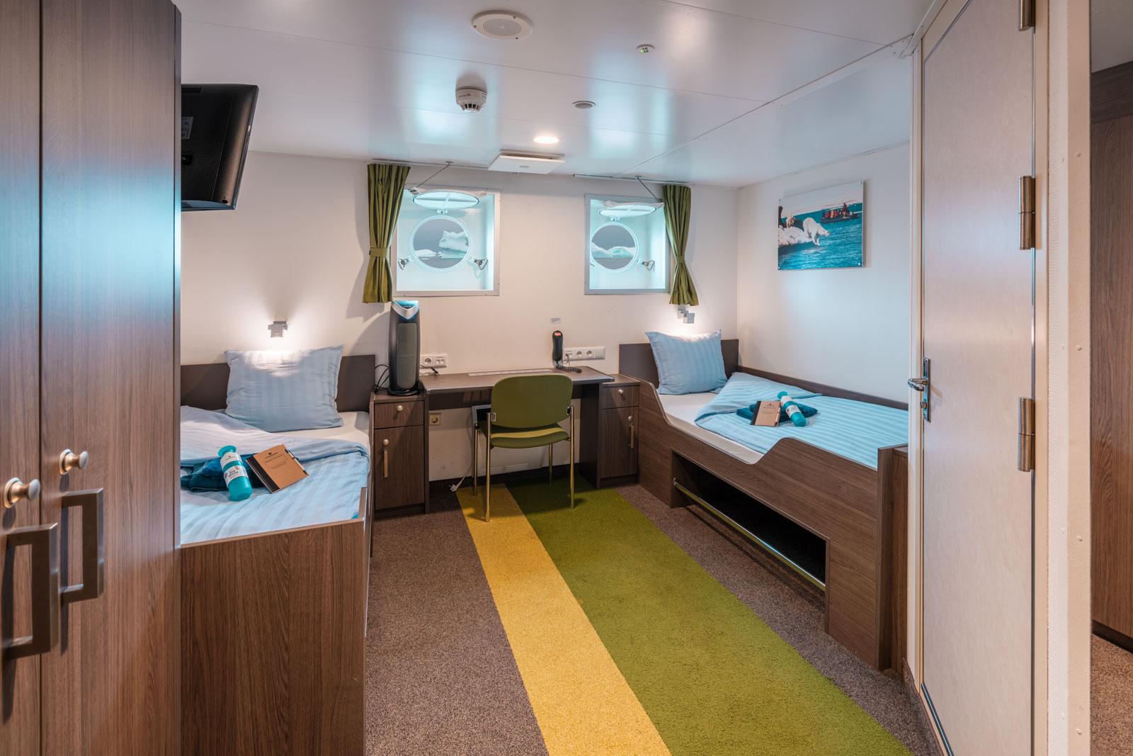 Die Zweibettkabinen befinden sich auf Deck 5. Sie sind ausgestattet mit zwei untenstehenden Einzelbetten. Zwei Fenster sorgen für Tageslicht und den Blick nach draußen. Ein privates Badezimmer mit Dusche/WC (Haartrockner vorhanden) sowie ein kleines Sofa, Tisch, Stuhl und TV komplettieren die Einrichtung.