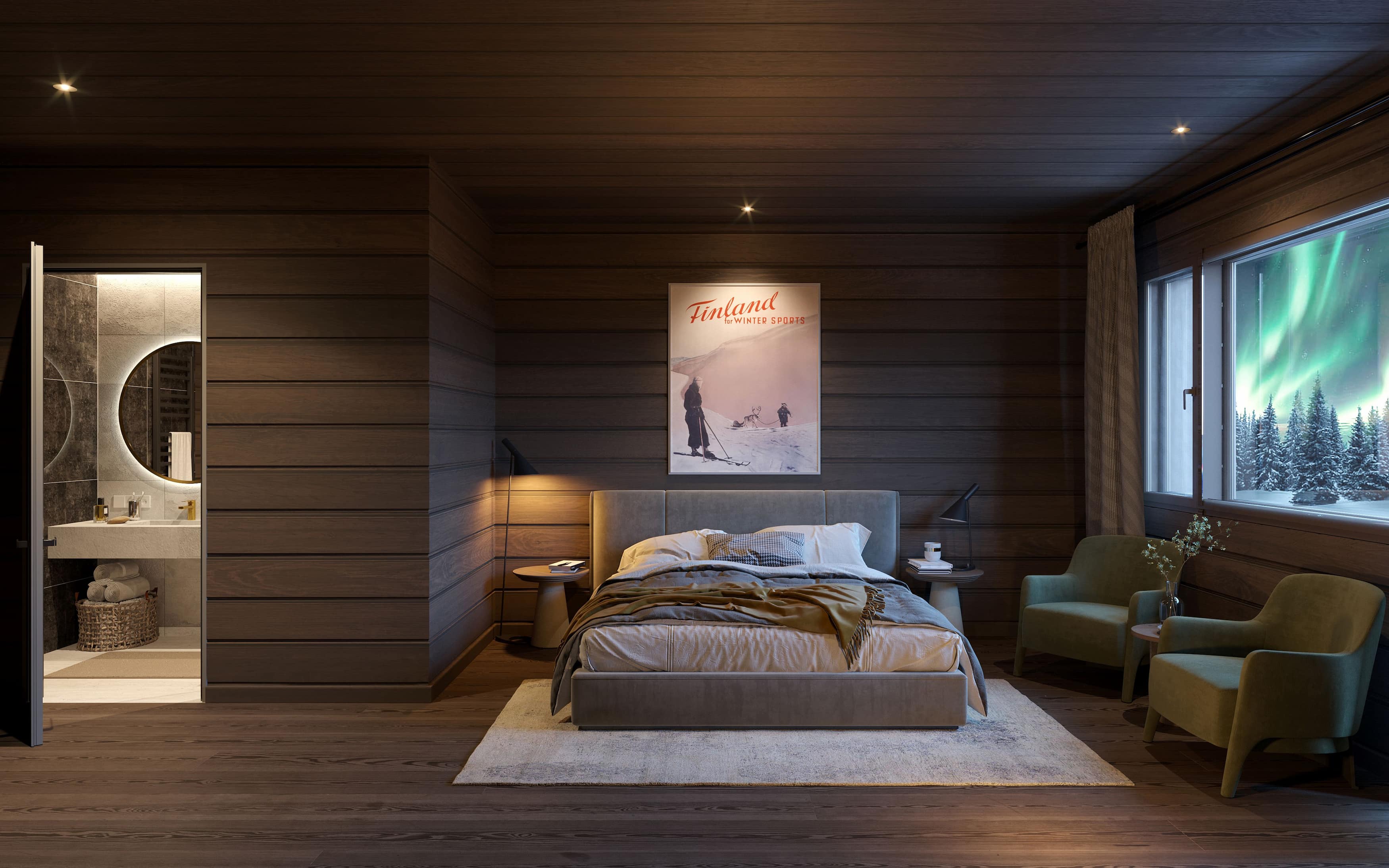 Die ca. 34 m² großen Superior Sauna Zimmer sind modern und in hellen Naturtönen gestaltet. Sie befinden sich in Blockhaus-Nebenhäusern mit je vier Einheiten. Ausgestattet mit Doppelbett, Du/WC, eigener Sauna, Haartrockner und Wasserkocher bieten sie behaglichen Komfort für entspannte Tage im Norden.
